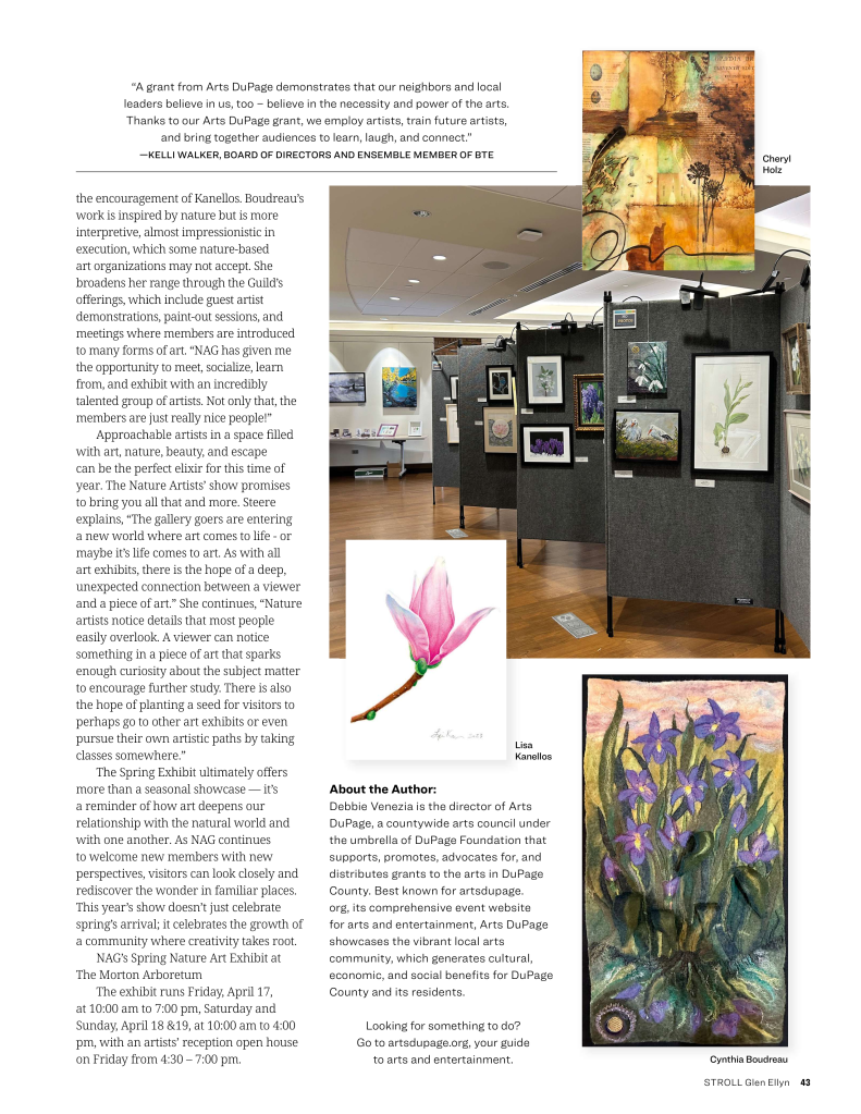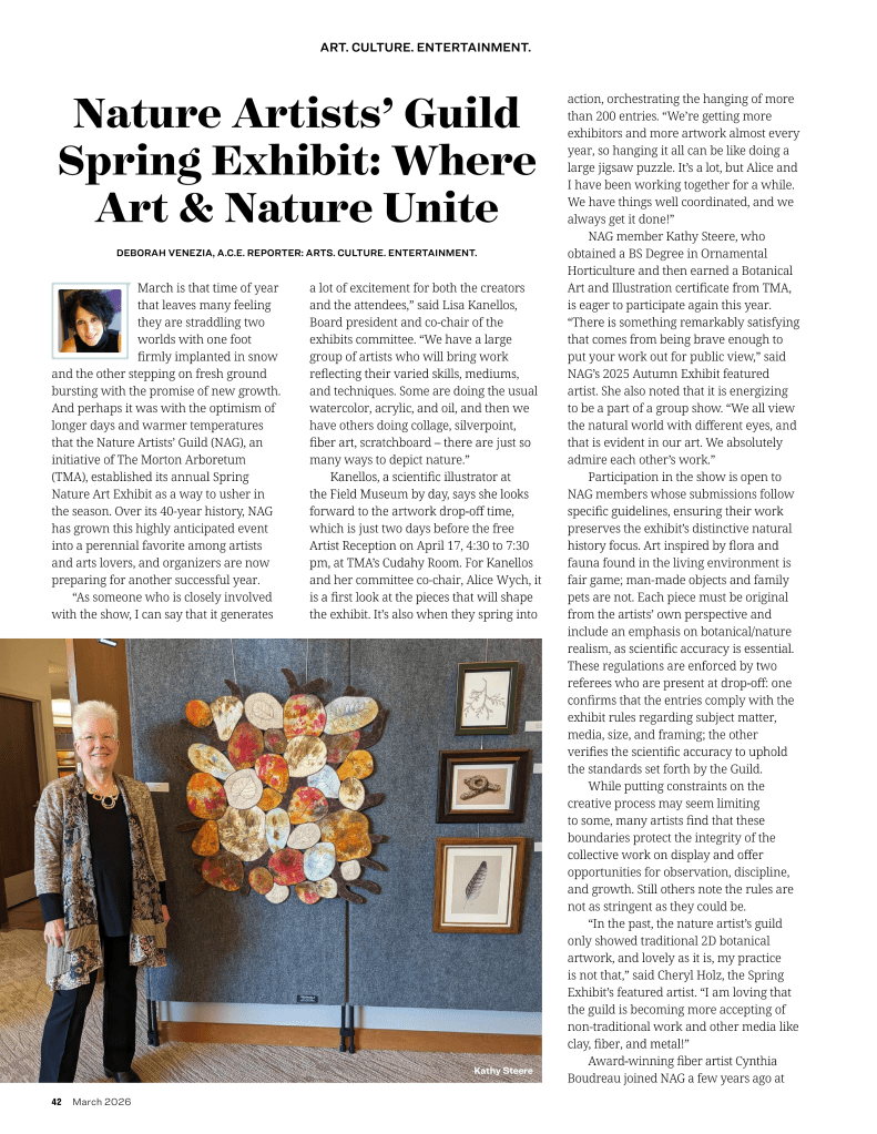 The 2026 Spring Art Exhibit by members of the Nature Artists’ Guild will be held this weekend, Friday, April 17 through Sunday, April 19, at The Morton Arboretum. More than 200 works of art by approximately 70 Guild members will be displayed.