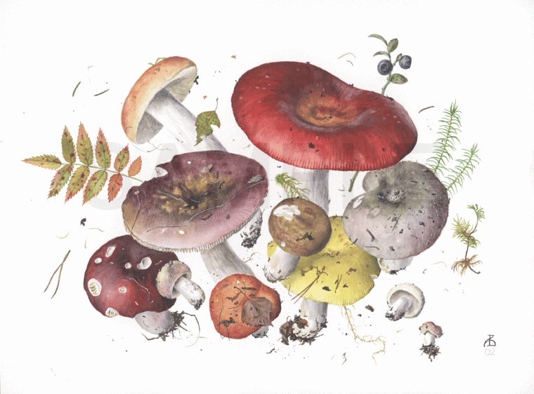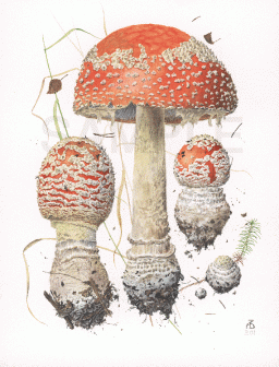 Amanita muscaria and Russula Bouquet II by Alexander “Sasha” Viazmensky represent his work in watercolor. Sasha specializes in portraying the mushrooms that he finds in the woods near his home in St. Petersburg, Russia. Sasha recently taught a class in mushroom painting here at the Arboretum, which was very popular with his students and everyone who was able to see his work and that of his class. Amanita muscaria is an original in watercolor and Russula Bouquet II is a print of his watercolor work.