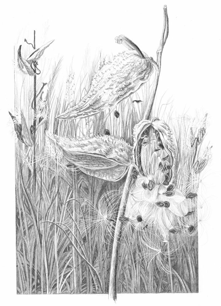 Winter Portrait: Asclepias syriaca by Karen Johnson is an example of scratchboard art. The scratchboard technique is normally associated with the use of ink, but here, Karen has created a black and white image with graphite. This original piece features dried milkweed pods with the seeds escaping against a prairie background.