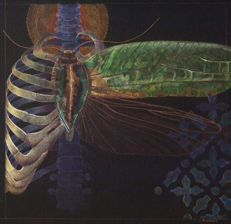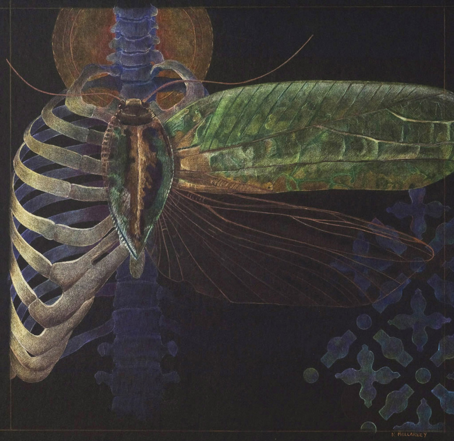 Sacred Union by Kimberly Mullarkey is an example of her delicate colored pencil work on a black background. The image is an imaginative combination of an insect with one wing outspread superimposed over the human skeleton.