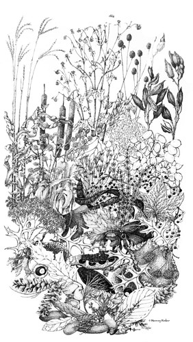 Participating members of the Nature Artists’ Guild’s 2019 Summer Encounter will each be creating their own large piece of nature art by adding to it each week.  Member Nancy Kolar’s finished progressive artwork is being used as an example, and shows that each week’s addition could be considered a completed piece of art.  Nancy used pen and ink in her piece, but participants can choose any one medium of their choice for the project.  Finished pieces will be on display at the August 1, 2019 Nature Artists’ Guild program.