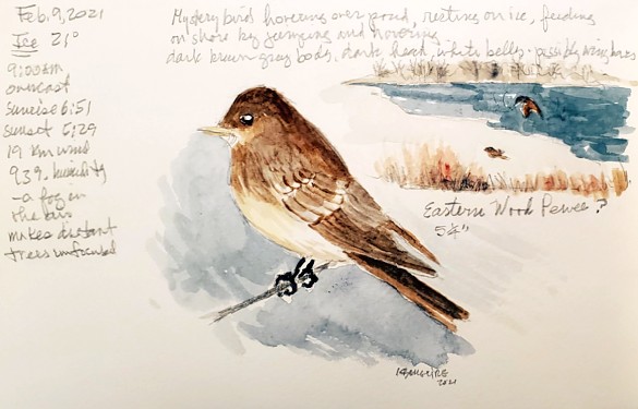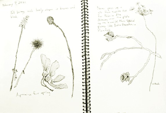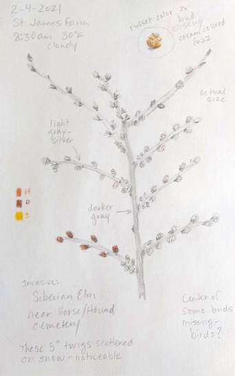 Kathy Belletire lives a bit farther south than many members and is seeing some of the birds that will reach us soon. She used a field guide to fill out the details of the red-headed woodpecker that visited her oak, but was unable to confirm the identity of her mystery bird. Jean Black continues to share her observations of the natural world, and Jill Spealman braved the cold to record a budding elm after being motivated by online nature-journaling classes by Carrie Carlson and John Muir Laws.