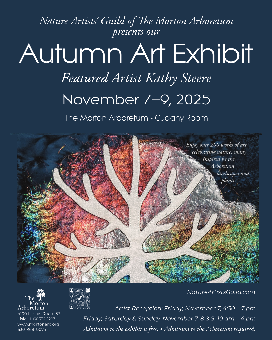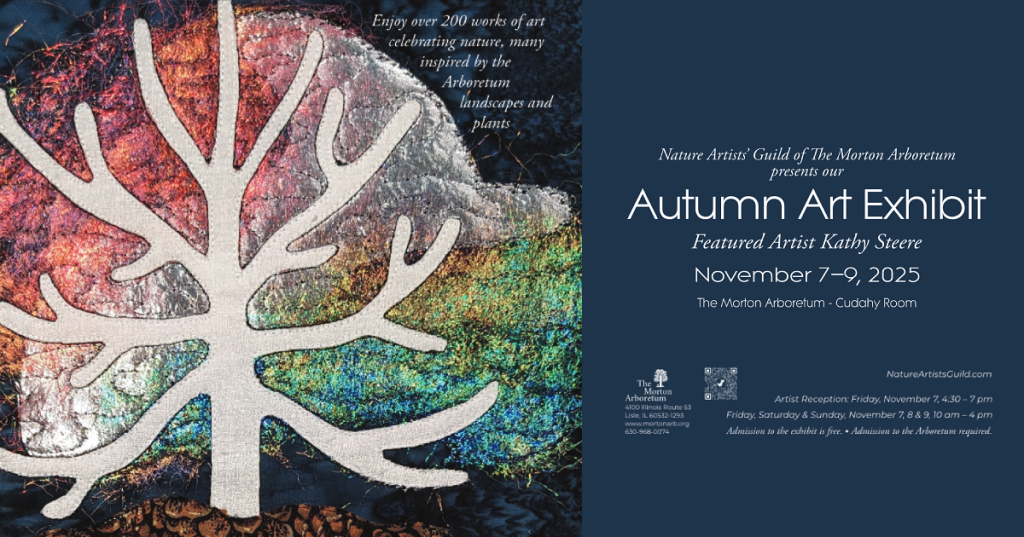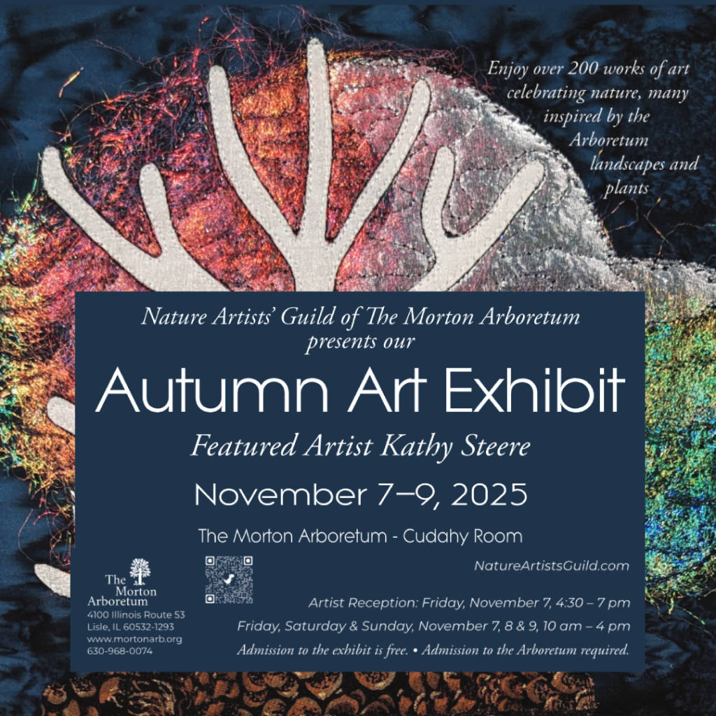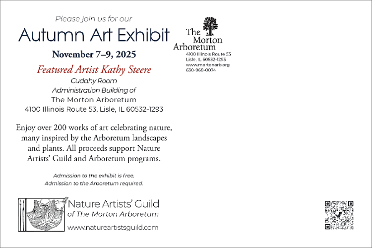 Please share any of the following invitations to the Nature Artists’ Guild 2025 Autumn Art Exhibit by email or social media. Scroll through and click on any image and download (right-click, alt-click, or long-press) to save or share. (Printed copies of the posters and postcards are available to pick up at the office of the Thornhill Education Center at The Morton Arboretum.)