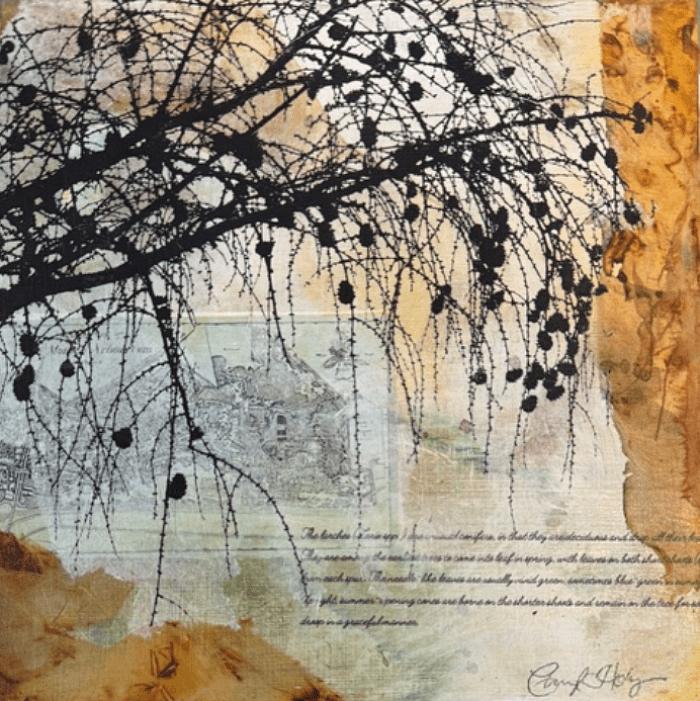 Lake Marmo Larches, copyright Cheryl Holz. Acrylic, old arboretum papers and rusted silk on wood panel.