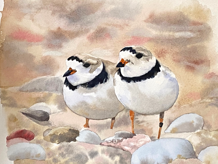 Piping Plovers, watercolor, copyright Vicki Liszewski will be one of more than twenty works exhibited this winter at the Wheaton Public Library by members of the Nature Artists’ Guild. (Read about Chicago’s beloved piping plovers here.)