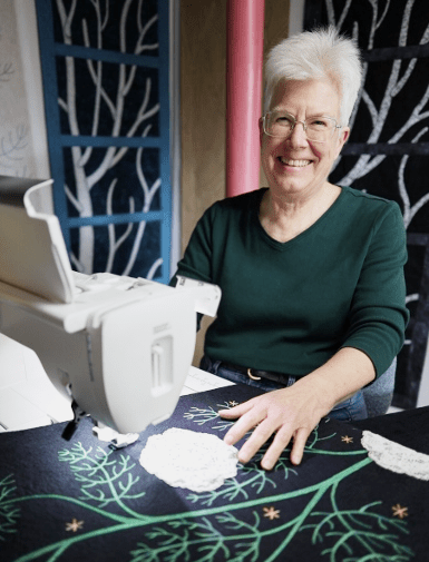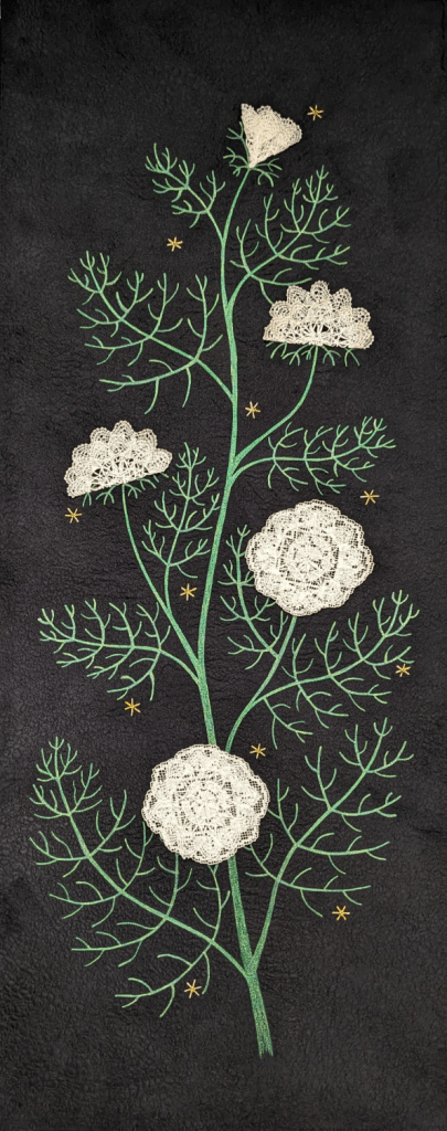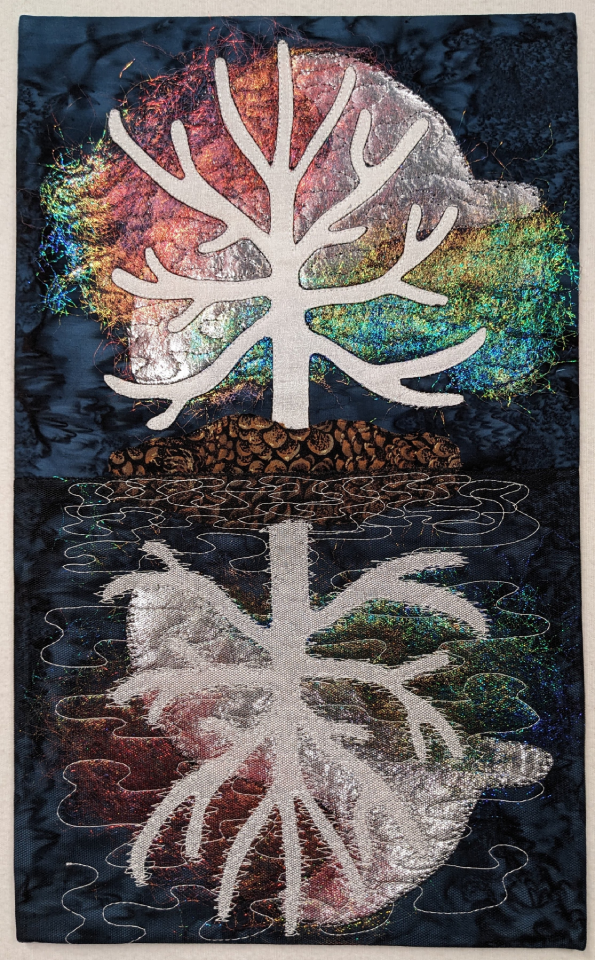 It was in trying to find my voice as an artist that I discovered art quilts. The idea of drawing with a power tool was/is very appealing! (Using a sewing machine on fabric.) In quilting terms, it is known as free-motion quilting. I use common quilting techniques to create wall art with fabric. Bonus: I don’t have to matte and frame it!