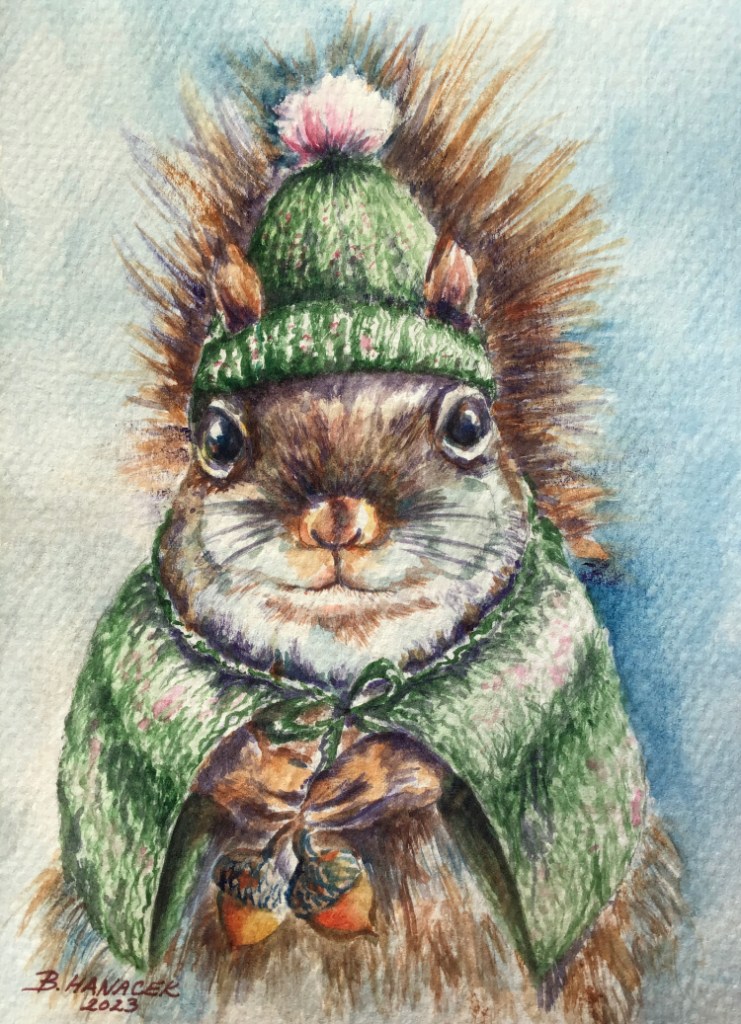 This festive, furry friend is ringing (clacking, actually) his bells (acorns, actually) to remind members of the Nature Artists’ Guild that it’s time to –
