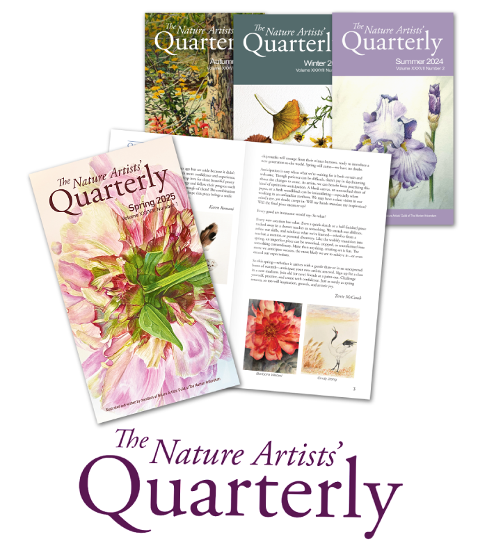 Copies of the Spring 2025 Nature Artists’ Quarterly(a members-only publication) will be arriving in mailboxes by the first week of March. The Quarterly includes news, artwork, and articles contributed by members of the Guild, all artfully presented by Publications Chair Jane Kellenberger.