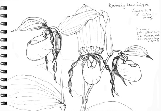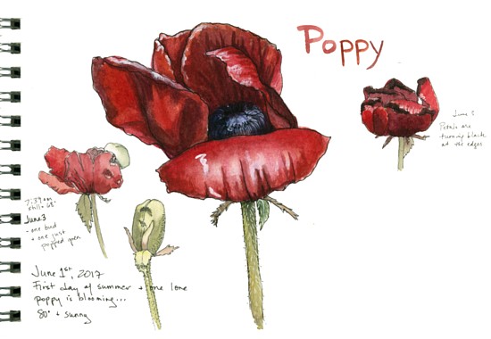 Notice that Karen has included the date, the weather, and a few details about the setting and plant. All of this information may be useful in future artwork. Perhaps more importantly, those details will greatly contribute to the wonderful memories of the experience (“First day of summer and one lone poppy is blooming”).