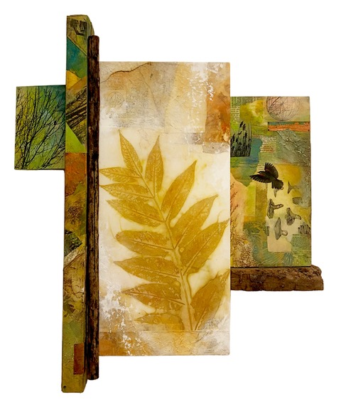 The ways I incorporate these influences have evolved over the years. I emulate natural aging processes in the studio with paint and materials, building up and wearing away like water on rock. I have always conscientiously collected specimens and learned how best to preserve and integrate them, but lately I have been using some more indirect techniques that also capture aspects of plants, trees, or a landscape. Being a process junkie, I’m now using Ecoprints, digital prints, silkscreened specimens, transfers, digitally cut silhouettes, and most recently archivally printed photographs in my work. I liken my process to jazz: after much preparation and research, I jump in and improvise with processes, not music notes, striving for equilibrium between spontaneity and deliberation.